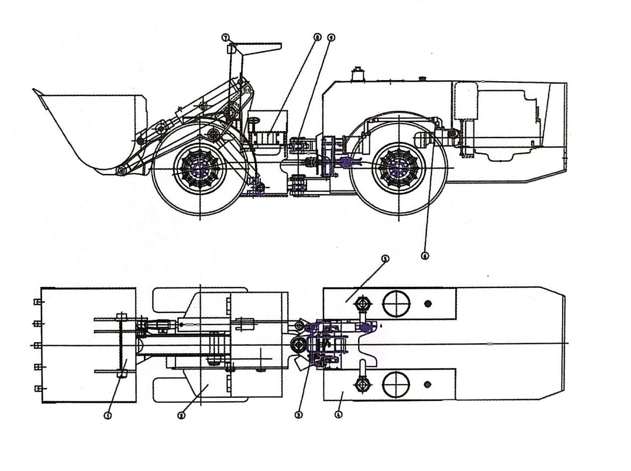 WZD-100C)型地下柴油裝運機包括前機架和后機架,中間部位用鉸接軸連接。前機架裝有工作機構、前驅動橋、轉向機構、工作操縱機構、行走調速控制機構、駕駛室等。后機架裝有電動機、靜液壓傳動系統、液壓卷纜機構、電器箱、減速器、后驅動橋,后端蓋,油泵驅動機構等,其總體結構見圖: